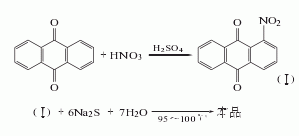 1.硝化還原法 蒽醌經混酸硝化得硝基蒽醌,反應產物過濾并用熱水洗至中性后,用亞硫酸鈉精制。其中2-硝基蒽醌與亞硫酸鈉生成易溶于水的蒽醌-2-磺酸鈉,過濾后洗滌除去之。所得1-硝基蒽醌用硫化鈉還原得1-氨基蒽醌粗品,經加堿液、保險粉精制除去二氨基蒽醌后再用氧氣氧化、過濾、干燥,得成品。